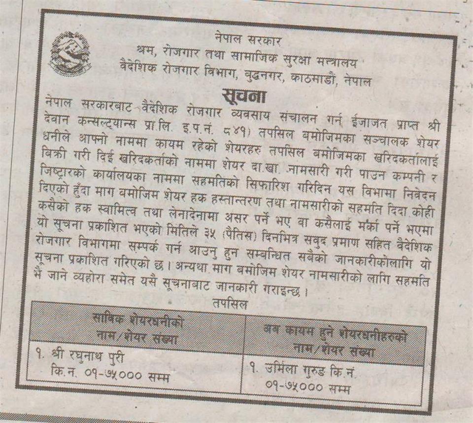 देवान कन्सल्टेन्टको शेयर दाखा सम्बन्धी सूचना